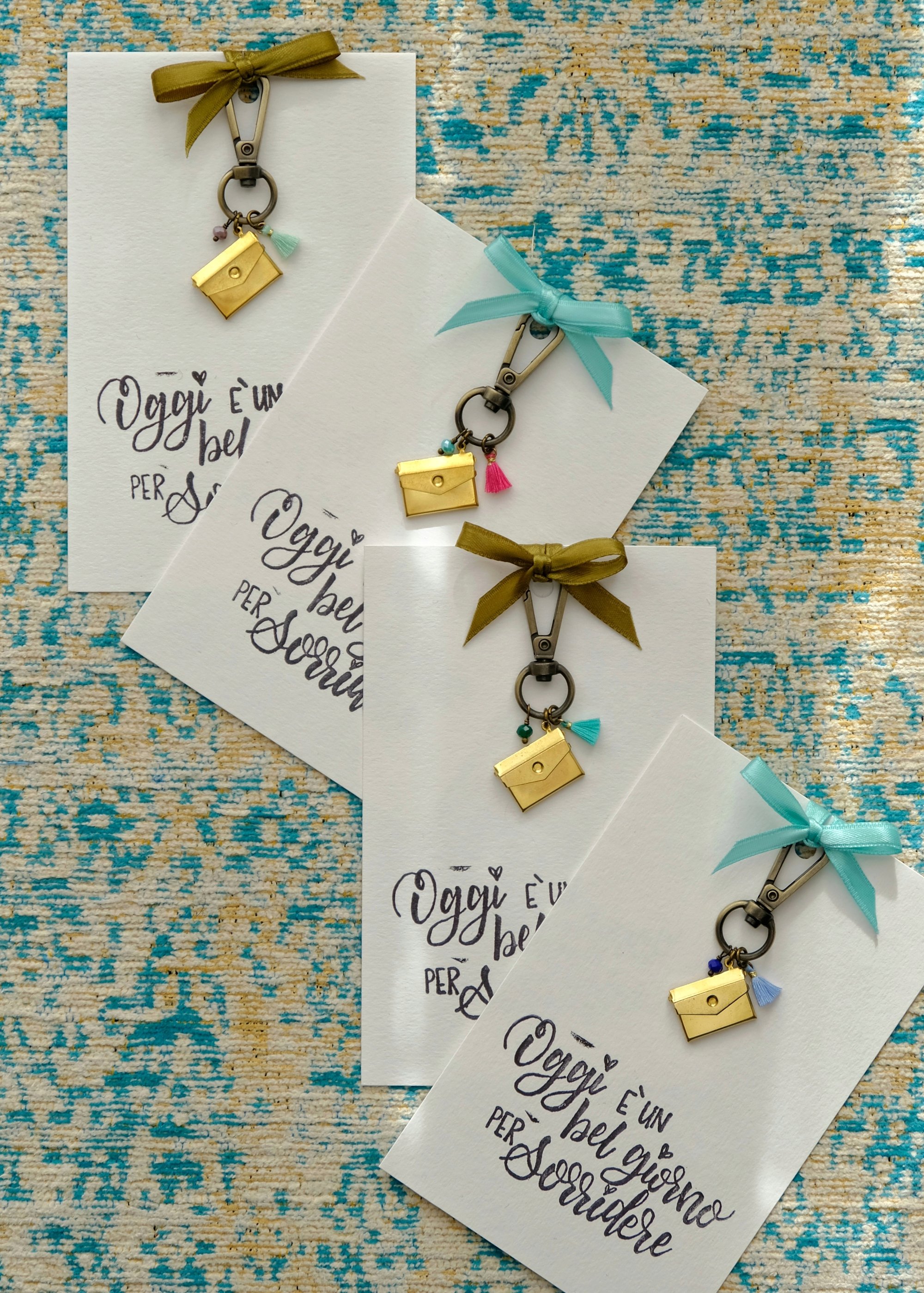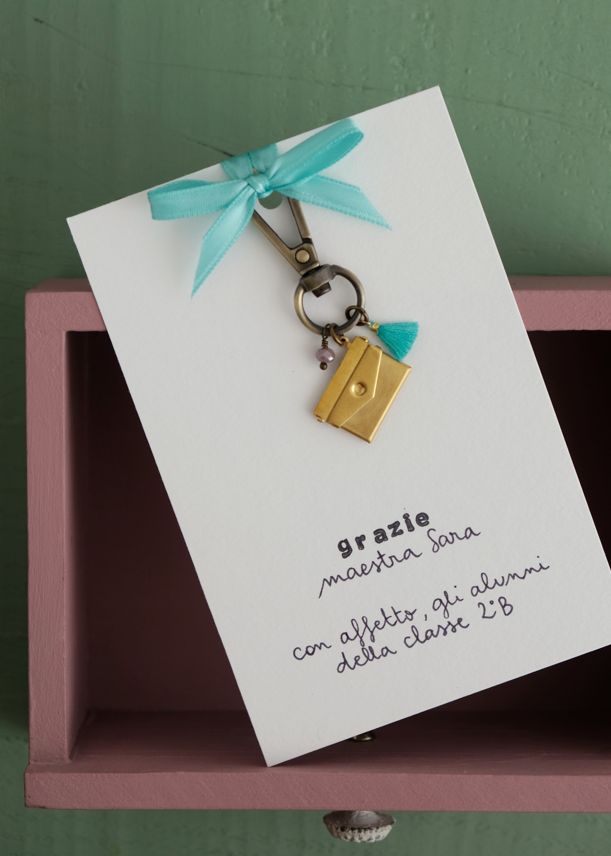 Piccolo accessorio dotato di moschettone, pensato per essere appeso al portapenne, allo zaino, alle chiavi, ad una borsa. E' reso speciale da un ciondolo apribile a forma di busta di lettera in ottone che custodisce al suo interno un bigliettino con messaggio.