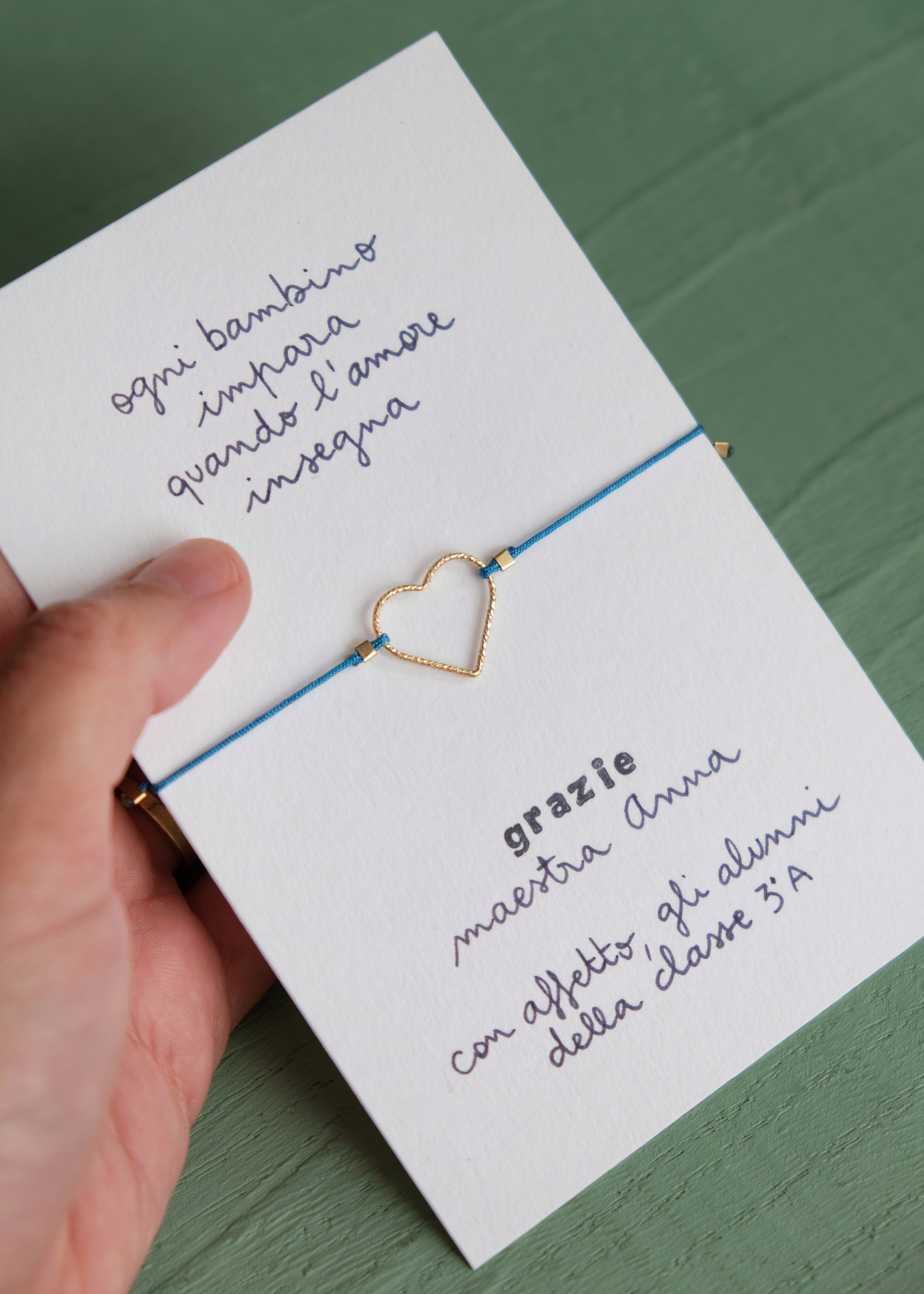 Nelle note d'acquisto o in una mail successiva all'ordine, chiedo di indicarmi per ogni colore di cordino scelto, il nome dell'insegnante e numero/sezione della classe che scriverò sul cartoncino. La frase a cui ho scelto di abbinare questo braccialetto "ogni bambino impara quando l'amore insegna" può essere eventualmente personalizzata con una frase alternativa a vostra scelta, più o meno della stessa lunghezza.