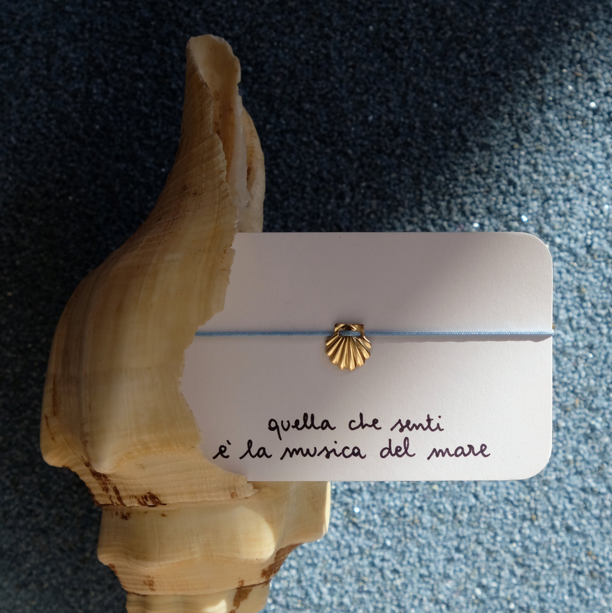 Ogni simbolo è accompagnato da una frase emozionale scelta per completarlo e contestualizzarne il significato: quella che senti è la musica del mare", in questo caso. La troverai scritta a mano da me sul cartoncino bianco che utilizzo per confezionare il braccialetto e che sarà un ulteriore ricordo da conservare.