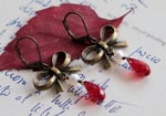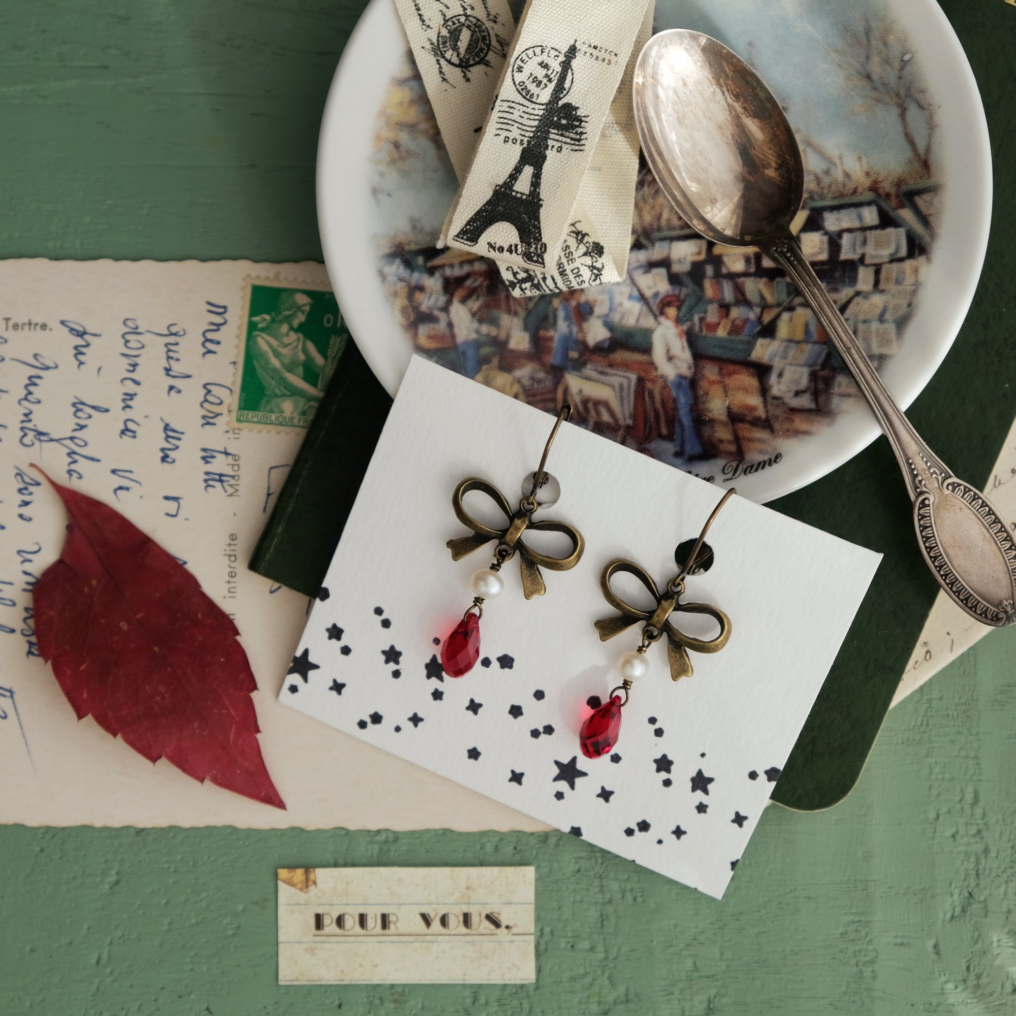 Realizzati in ottone, senza nichel, con fiocco accompagnato da una perlina fiume e da una goccia Swarovski trasparente rossa.