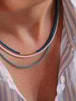 Nella quarta foto, girocollo Orizzonte blu con bacchetta in ottone placcato oro abbinato a due girocolli Passpartout, uno bianco e l'altro turchese.