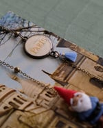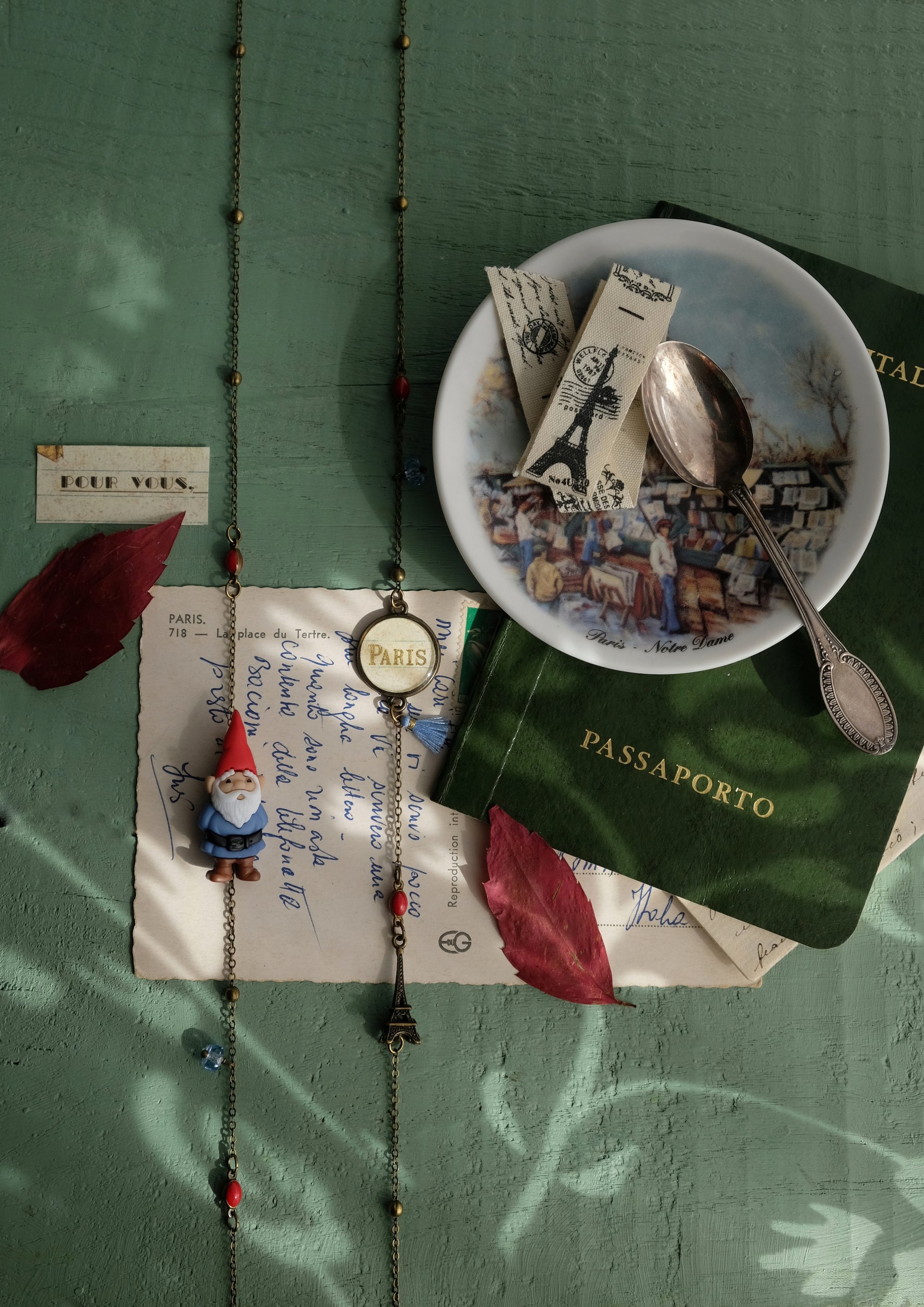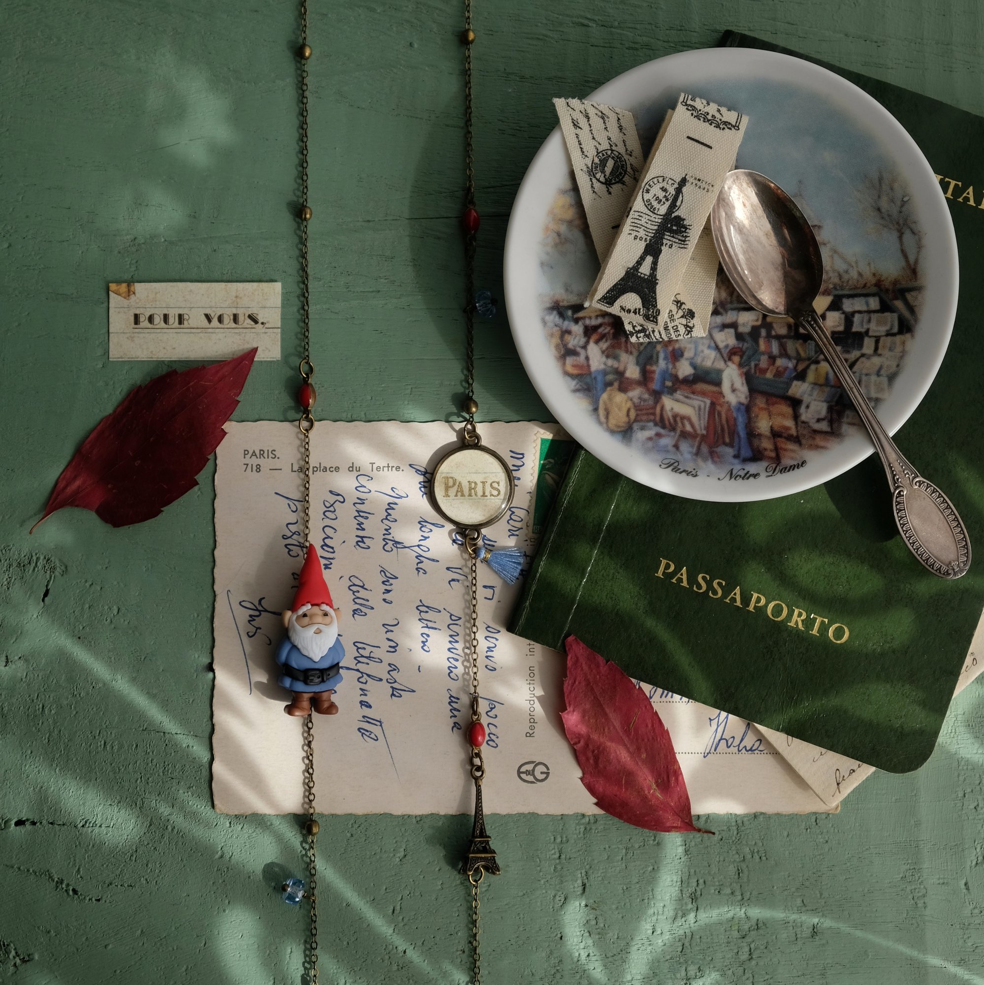 - una medaglietta tonda con la scritta Paris dorata lavorata artigianalmente dal ritaglio di una carta acquistata tanti anni fa in una bottega storica (vedi foto 3),